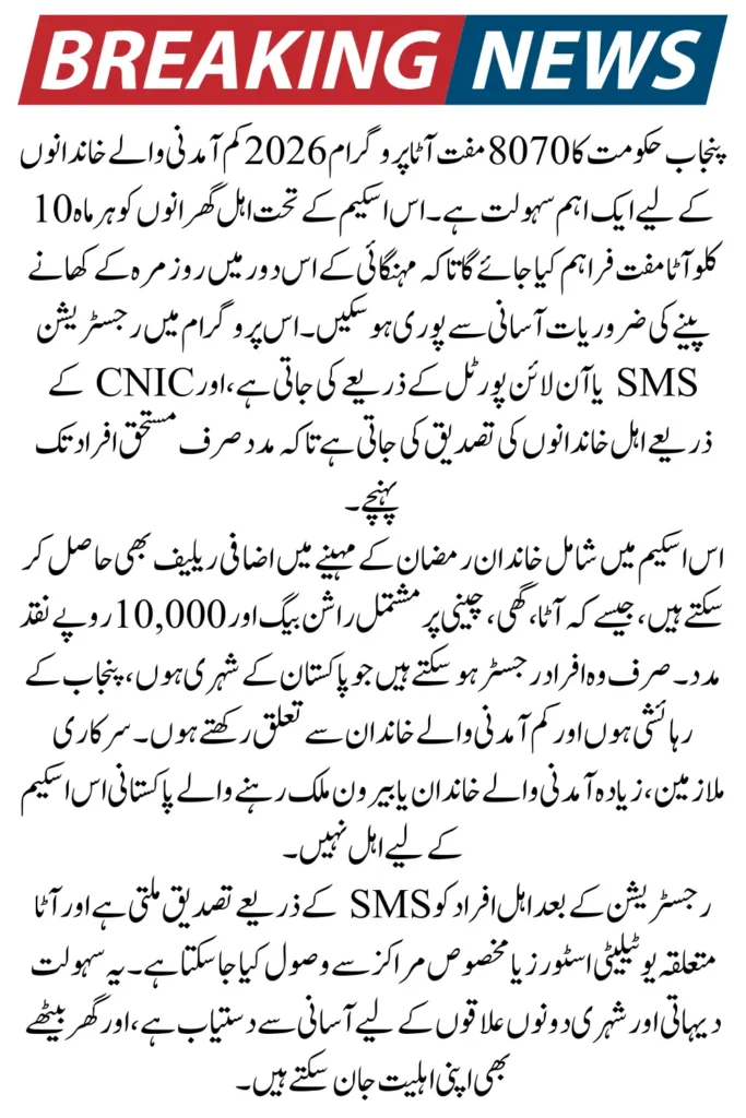 The 8070 Muft Atta Scheme 2026 is a vital initiative to support low-income families in Punjab, especially during periods of inflation and Ramzan. Its CNIC-based digital registration ensures transparency, speed, and direct access to aid.