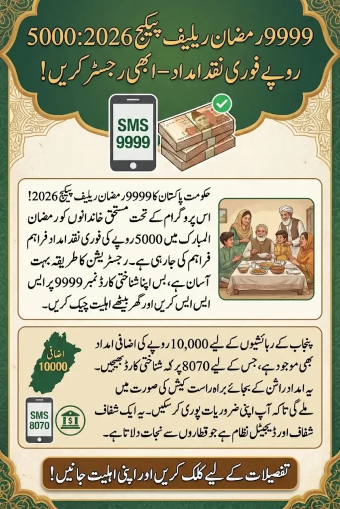 The 9999 Ramzan Relief Package 2026 is an important initiative designed to support low-income families during Ramadan. With a simple SMS registration system, eligible households can receive PKR 5,000 financial assistance quickly and securely.
