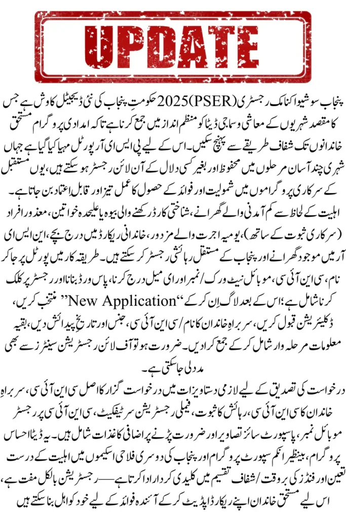 PSER Punjab Socio-Economic Registry 2026 is designed to include citizens who are in need of social and financial assistance. By registering, families can ensure that their records are updated for government welfare schemes and future assistance programs.